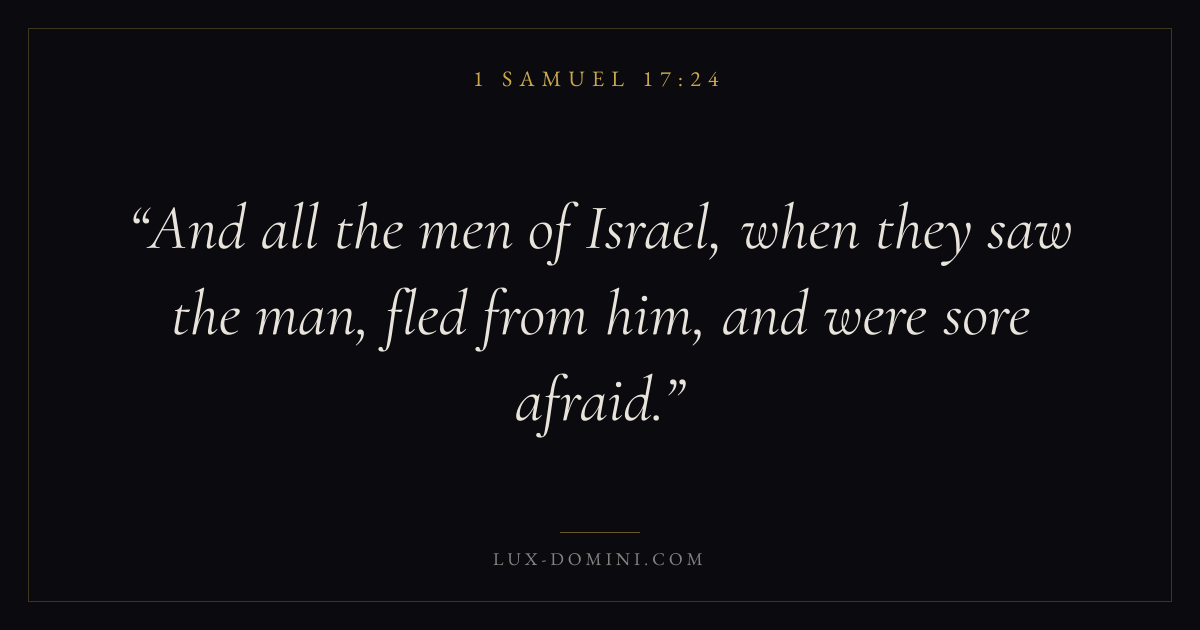 Books / 1 Samuel / Chapter 17 / Verse 24 ← 1 Samuel 17:23 1 Samuel 17:24 1 Samuel 17:25 → And all the men of Israel, when they saw the man, fled from him, and were sore afraid. Download verse card Share on Twitter Share on Facebook Pin it ✦ Key themes HopeAnxiety and fearWisdomLeadership Read with 1 Samuel 17:201 Samuel 17:21Romans 8:24Revelation 21:4 Related topics Bible verses about hopeBible verses about anxiety and fearBible verses about wisdomBible verses about leadership ✦ 1 Samuel Chapter 17 verses V. 1 V. 2 V. 3 V. 4 V. 5 V. 6 V. 7 V. 8 V. 9 V. 10 V. 11 V. 12 V. 13 V. 14 V. 15 V. 16 V. 17 V. 18 V. 19 V. 20 V. 21 V. 22 V. 23 V. 24 V. 25 V. 26 V. 27 V. 28 V. 29 V. 30 V. 31 V. 32 V. 33 V. 34 V. 35 V. 36 V. 37 V. 38 V. 39 V. 40 V. 41 V. 42 V. 43 V. 44 V. 45 V. 46 V. 47 V. 48 V. 49 V. 50 V. 51 V. 52 V. 53 V. 54 V. 55 V. 56 V. 57 V. 58