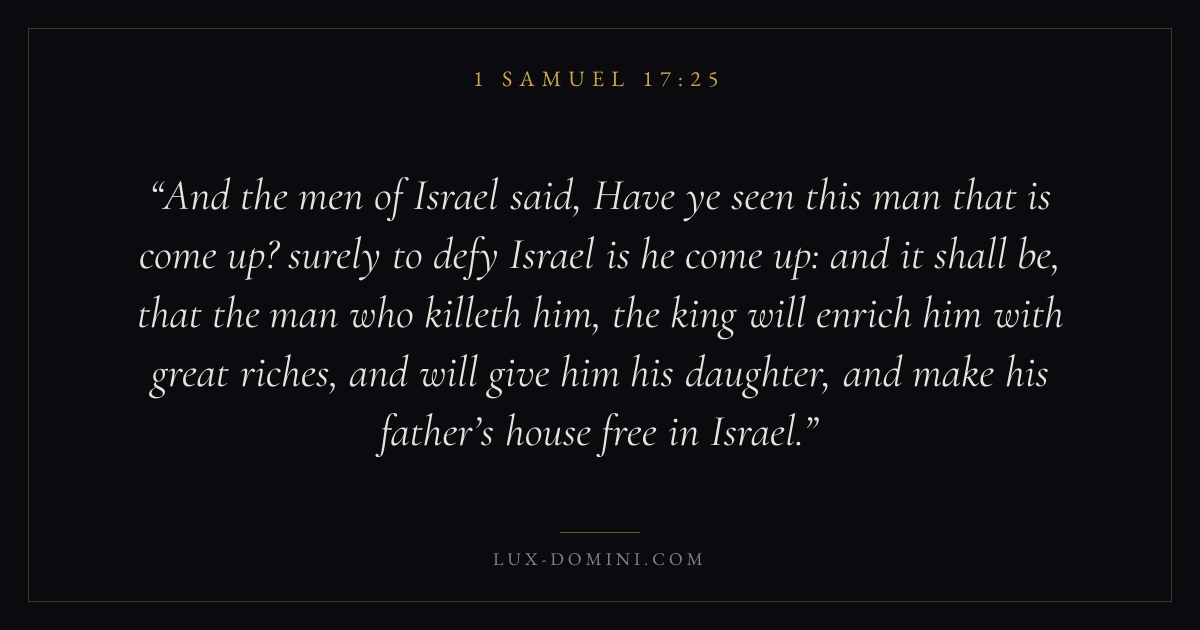 And the men of Israel said, Have ye seen this man that is come up? surely to defy Israel is he come up: and it shall be, that the man who killeth him, the king will enrich him with great riches, and will give him his daughter, and make his father’s house free in Israel.