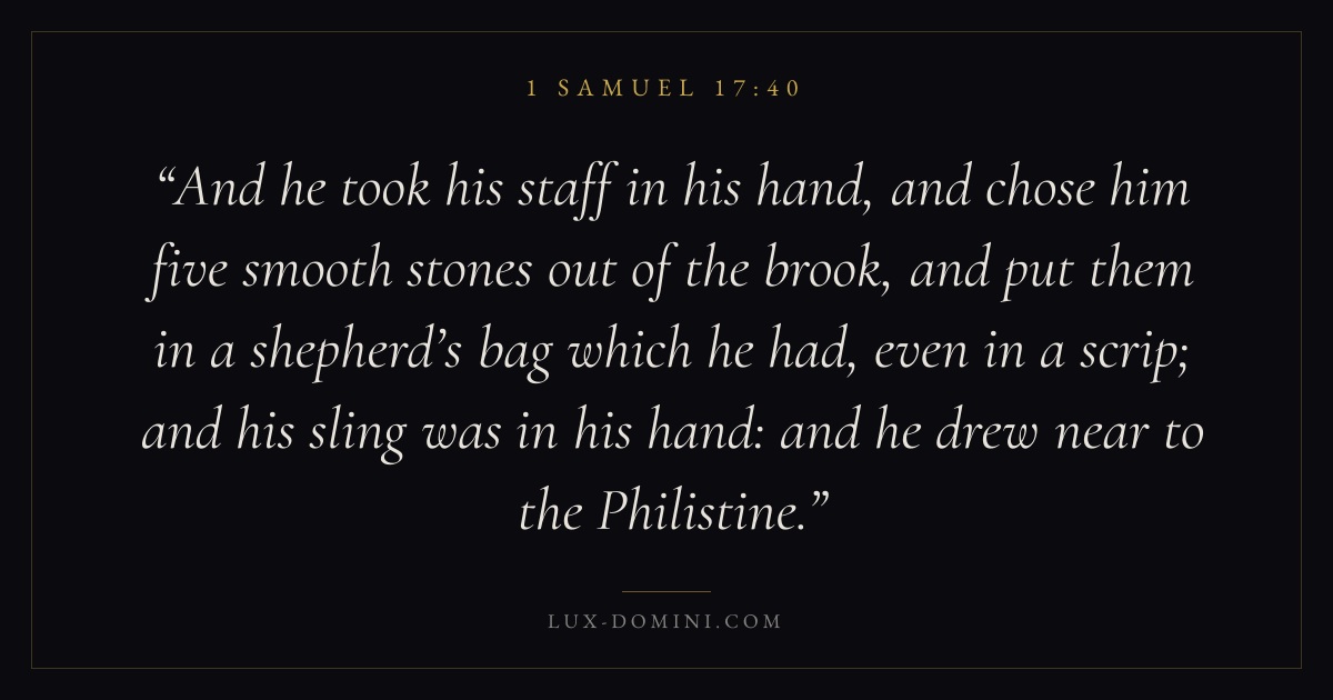 And he took his staff in his hand, and chose him five smooth stones out of the brook, and put them in a shepherd’s bag which he had, even in a scrip; and his sling was in his hand: and he drew near to the Philistine.