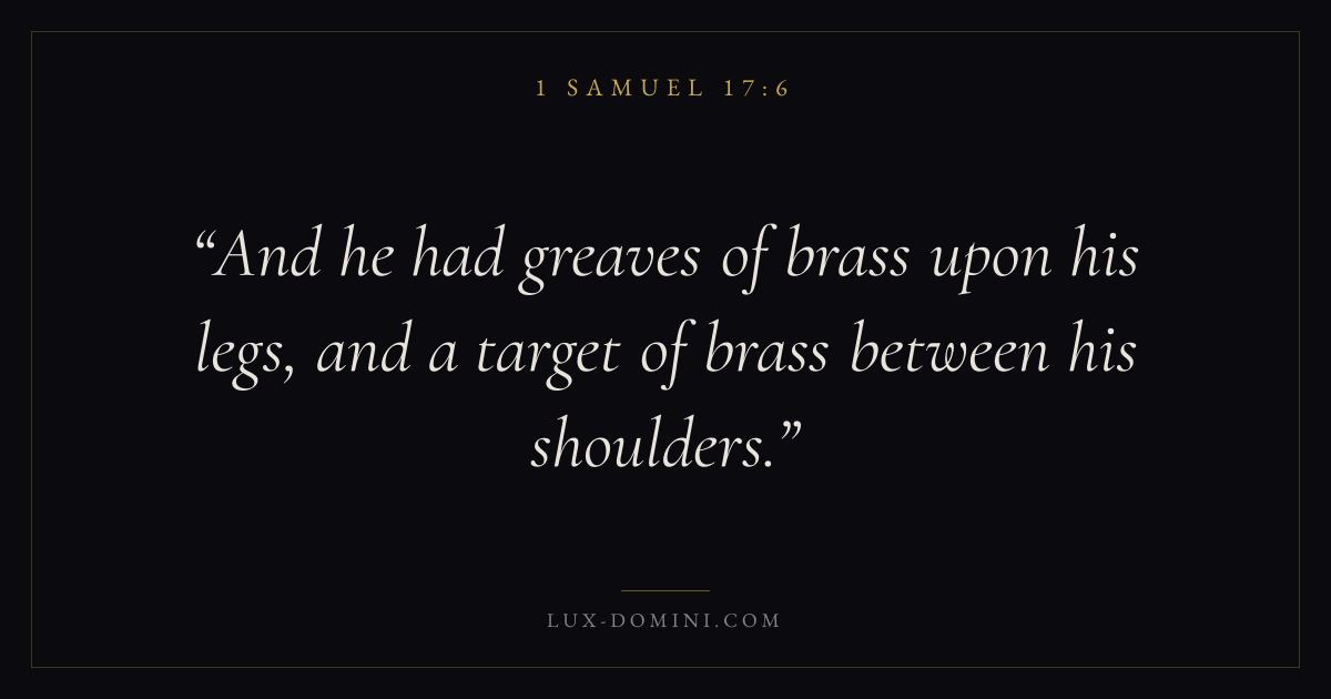 Books / 1 Samuel / Chapter 17 / Verse 6 ← 1 Samuel 17:5 1 Samuel 17:6 1 Samuel 17:7 → And he had greaves of brass upon his legs, and a target of brass between his shoulders. Download verse card Share on Twitter Share on Facebook Pin it ✦ Key themes HopeLeadershipAnointingObedience Read with 1 Samuel 17:41 Samuel 17:5Romans 8:24Revelation 21:4 Related topics Bible verses about hopeBible verses about leadershipBible verses about obedience ✦ 1 Samuel Chapter 17 verses V. 1 V. 2 V. 3 V. 4 V. 5 V. 6 V. 7 V. 8 V. 9 V. 10 V. 11 V. 12 V. 13 V. 14 V. 15 V. 16 V. 17 V. 18 V. 19 V. 20 V. 21 V. 22 V. 23 V. 24 V. 25 V. 26 V. 27 V. 28 V. 29 V. 30 V. 31 V. 32 V. 33 V. 34 V. 35 V. 36 V. 37 V. 38 V. 39 V. 40 V. 41 V. 42 V. 43 V. 44 V. 45 V. 46 V. 47 V. 48 V. 49 V. 50 V. 51 V. 52 V. 53 V. 54 V. 55 V. 56 V. 57 V. 58