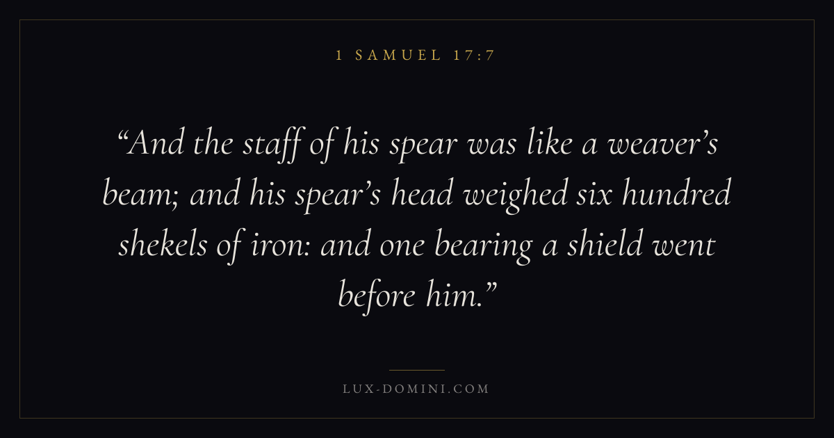 And the staff of his spear was like a weaver’s beam; and his spear’s head weighed six hundred shekels of iron: and one bearing a shield went before him.