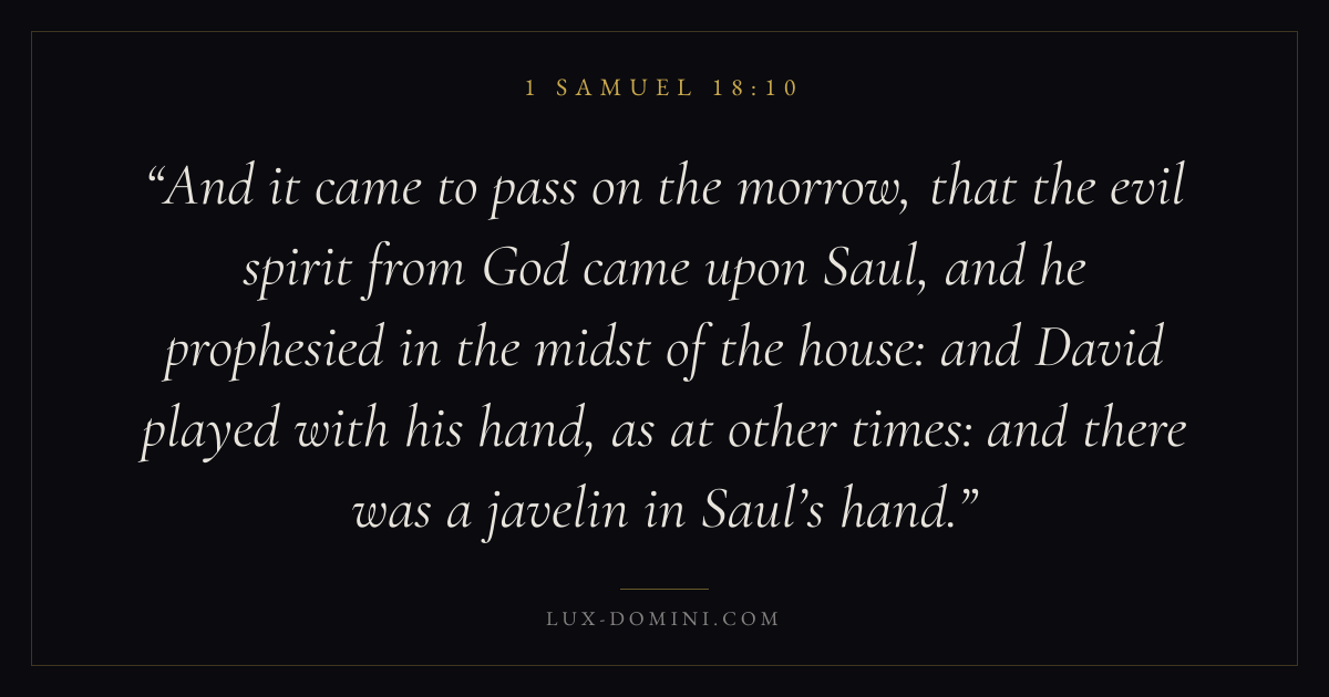 And it came to pass on the morrow, that the evil spirit from God came upon Saul, and he prophesied in the midst of the house: and David played with his hand, as at other times: and there was a javelin in Saul’s hand.