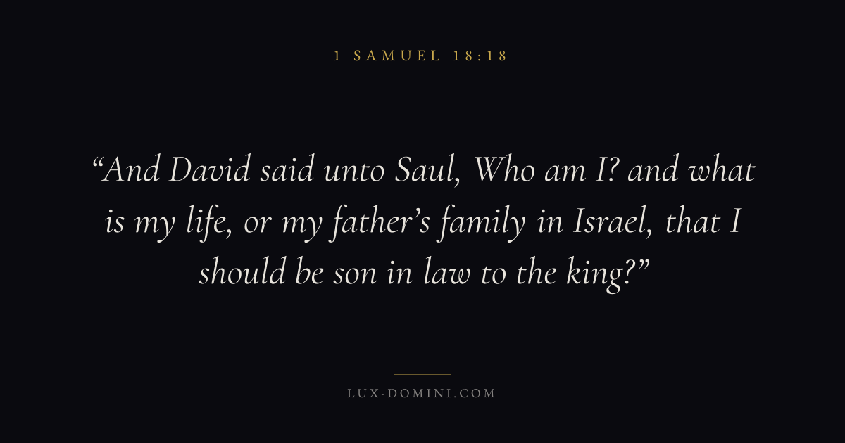 And David said unto Saul, Who am I? and what is my life, or my father’s family in Israel, that I should be son in law to the king?