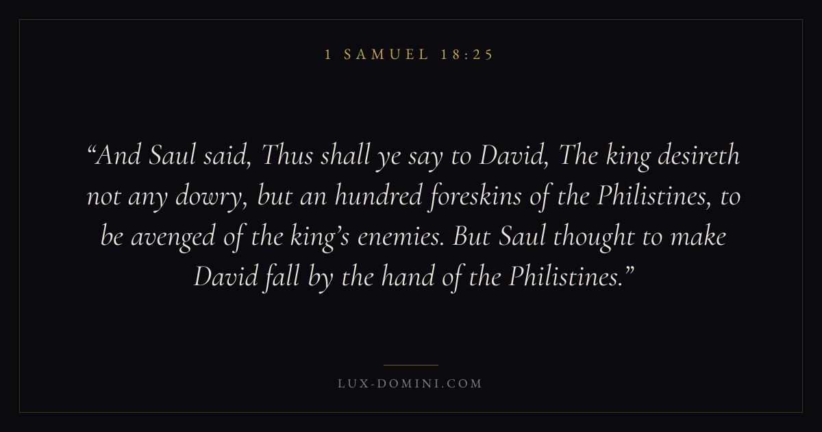 And Saul said, Thus shall ye say to David, The king desireth not any dowry, but an hundred foreskins of the Philistines, to be avenged of the king’s enemies. But Saul thought to make David fall by the hand of the Philistines.