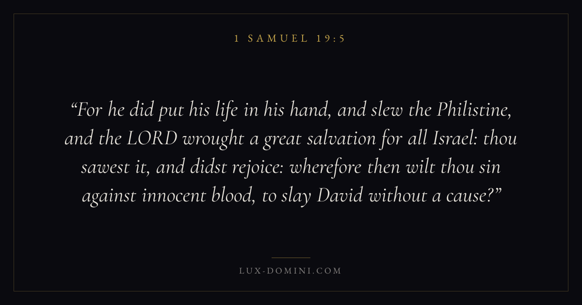 For he did put his life in his hand, and slew the Philistine, and the LORD wrought a great salvation for all Israel: thou sawest it, and didst rejoice: wherefore then wilt thou sin against innocent blood, to slay David without a cause?