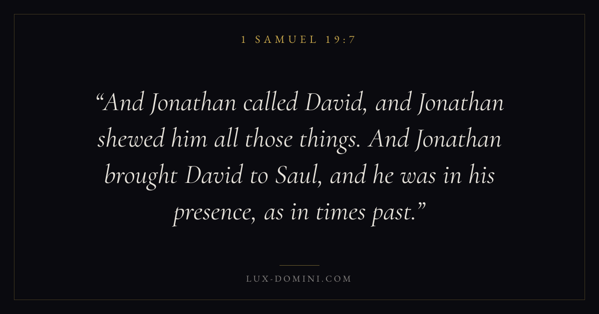 And Jonathan called David, and Jonathan shewed him all those things. And Jonathan brought David to Saul, and he was in his presence, as in times past.