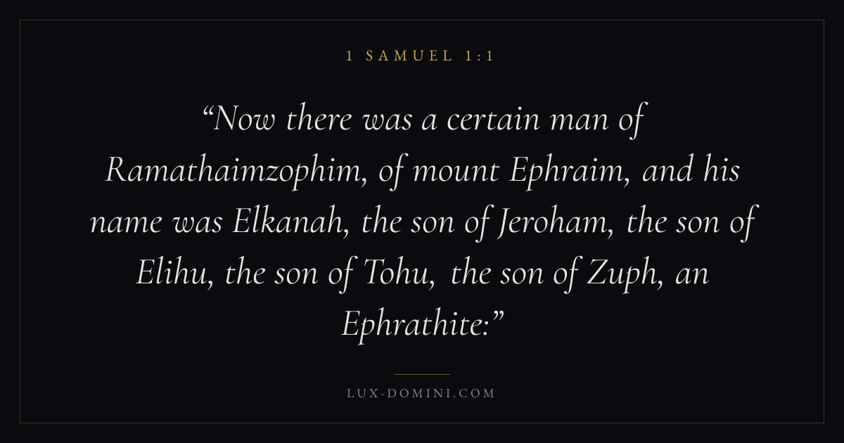 Now there was a certain man of Ramathaimzophim, of mount Ephraim, and his name was Elkanah, the son of Jeroham, the son of Elihu, the son of Tohu, the son of Zuph, an Ephrathite: