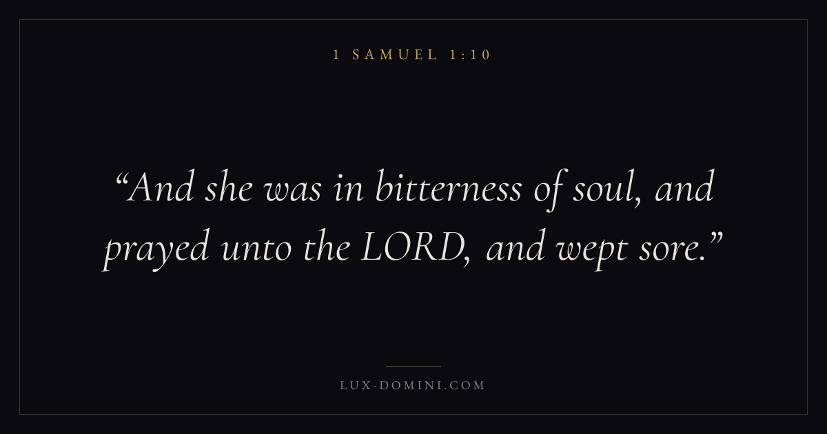 Books / 1 Samuel / Chapter 1 / Verse 10 ← 1 Samuel 1:9 1 Samuel 1:10 1 Samuel 1:11 → And she was in bitterness of soul, and prayed unto the LORD, and wept sore. Download verse card Share on Twitter Share on Facebook Pin it ✦ Key themes HopeAnxiety and fearSuffering and trialsPrayerLeadership Read with 1 Samuel 1:91 Samuel 1:11Romans 8:24Revelation 21:4 Related topics Bible verses about hopeBible verses about anxiety and fearBible verses about suffering and trialsBible verses about prayerBible verses about leadership ✦ 1 Samuel Chapter 1 verses V. 1 V. 2 V. 3 V. 4 V. 5 V. 6 V. 7 V. 8 V. 9 V. 10 V. 11 V. 12 V. 13 V. 14 V. 15 V. 16 V. 17 V. 18 V. 19 V. 20 V. 21 V. 22 V. 23 V. 24 V. 25 V. 26 V. 27 V. 28