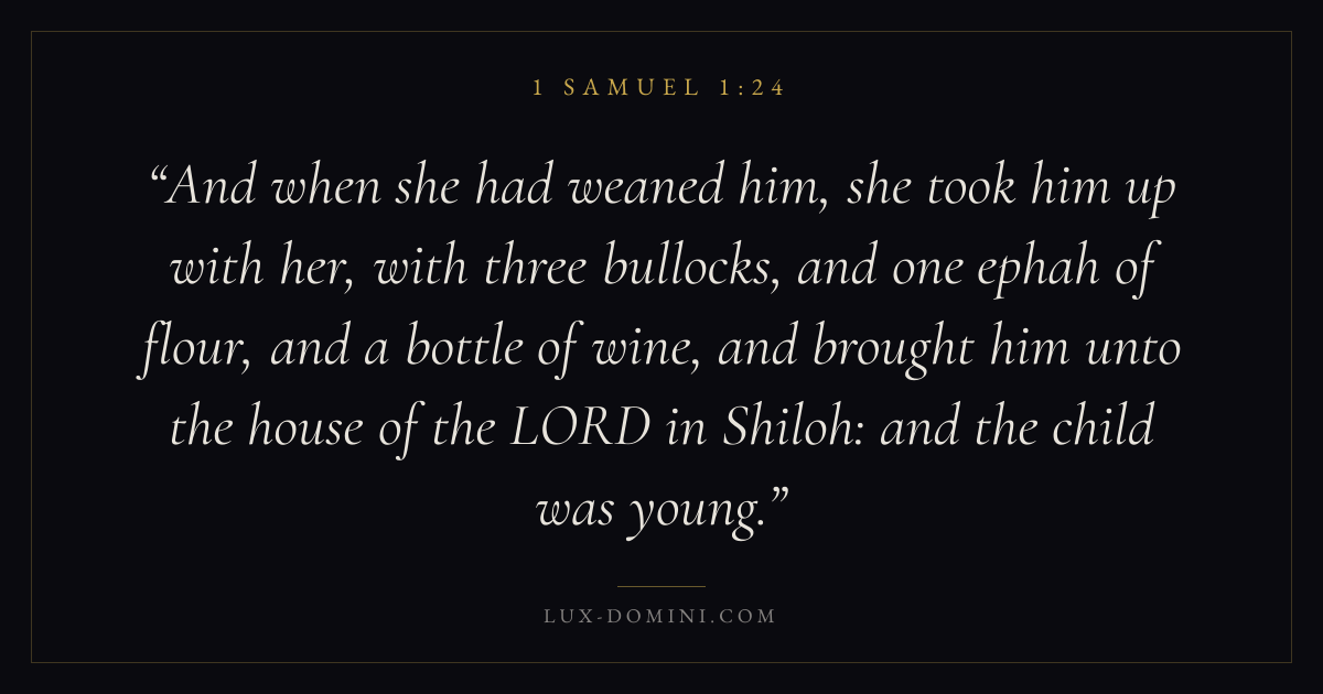 And when she had weaned him, she took him up with her, with three bullocks, and one ephah of flour, and a bottle of wine, and brought him unto the house of the LORD in Shiloh: and the child was young.