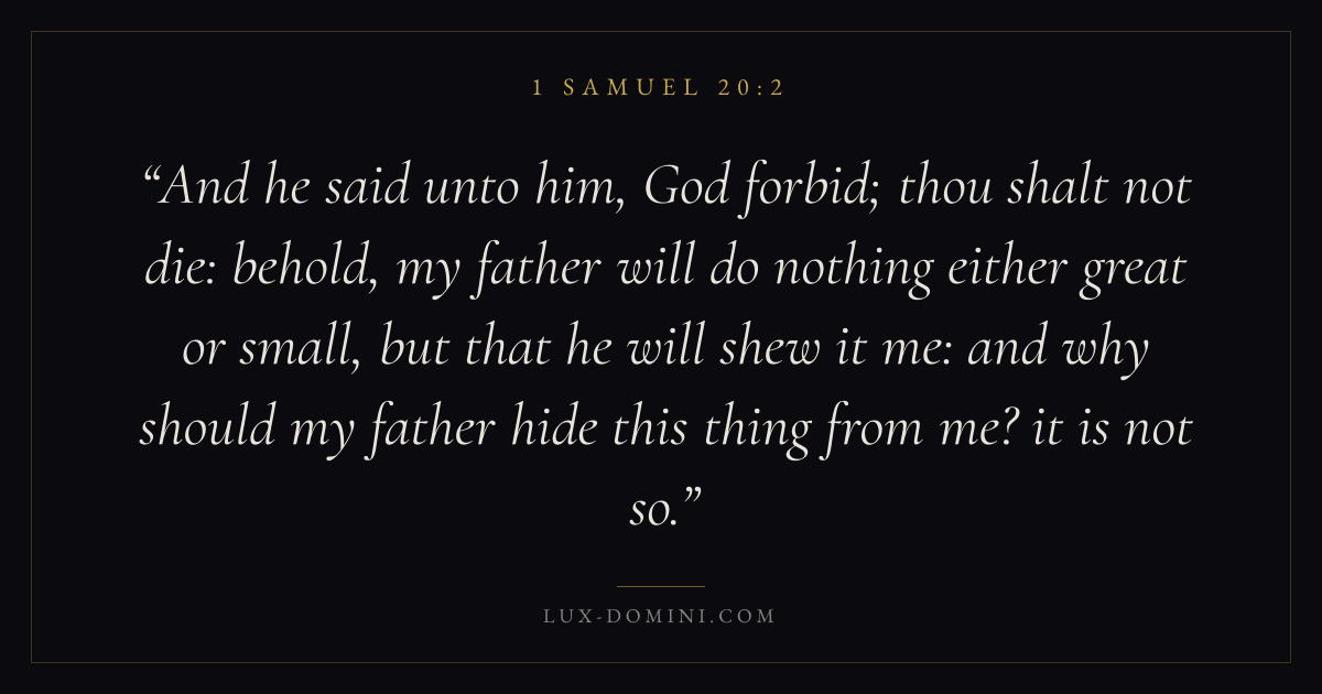 And he said unto him, God forbid; thou shalt not die: behold, my father will do nothing either great or small, but that he will shew it me: and why should my father hide this thing from me? it is not so.