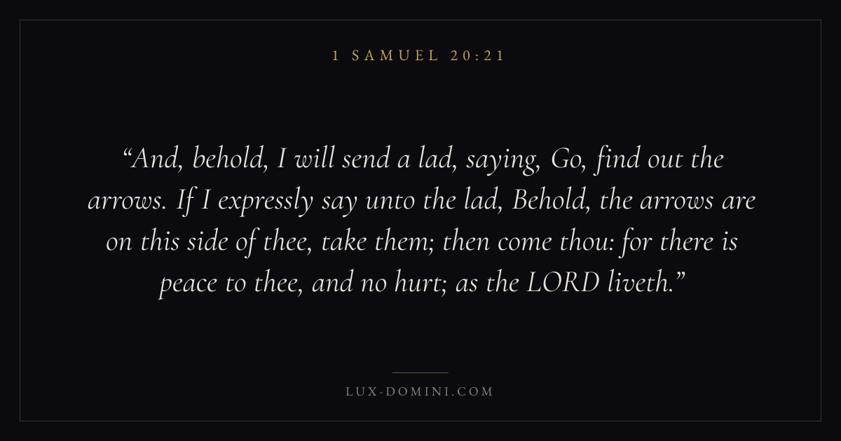 And, behold, I will send a lad, saying, Go, find out the arrows. If I expressly say unto the lad, Behold, the arrows are on this side of thee, take them; then come thou: for there is peace to thee, and no hurt; as the LORD liveth.