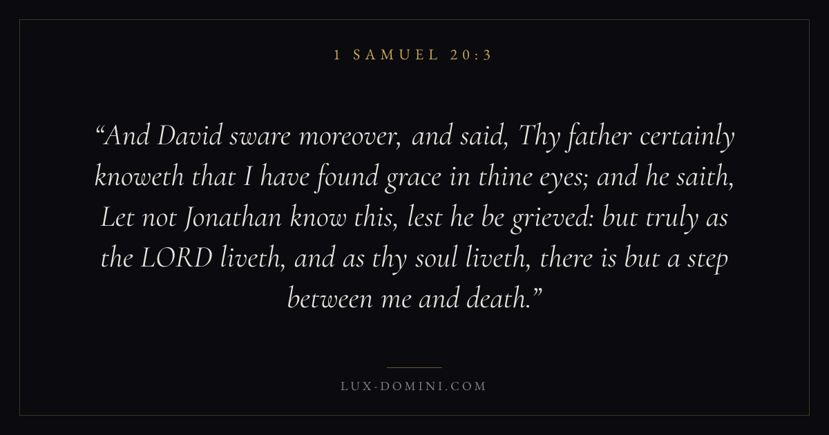 And David sware moreover, and said, Thy father certainly knoweth that I have found grace in thine eyes; and he saith, Let not Jonathan know this, lest he be grieved: but truly as the LORD liveth, and as thy soul liveth, there is but a step between me and death.