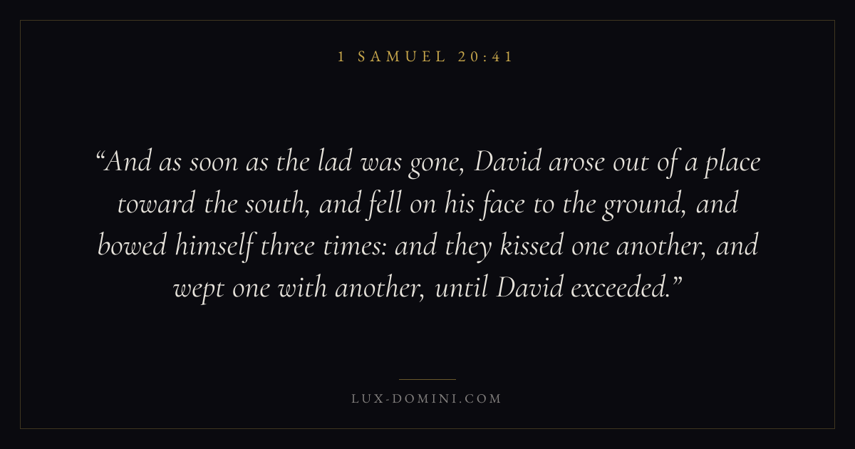 And as soon as the lad was gone, David arose out of a place toward the south, and fell on his face to the ground, and bowed himself three times: and they kissed one another, and wept one with another, until David exceeded.