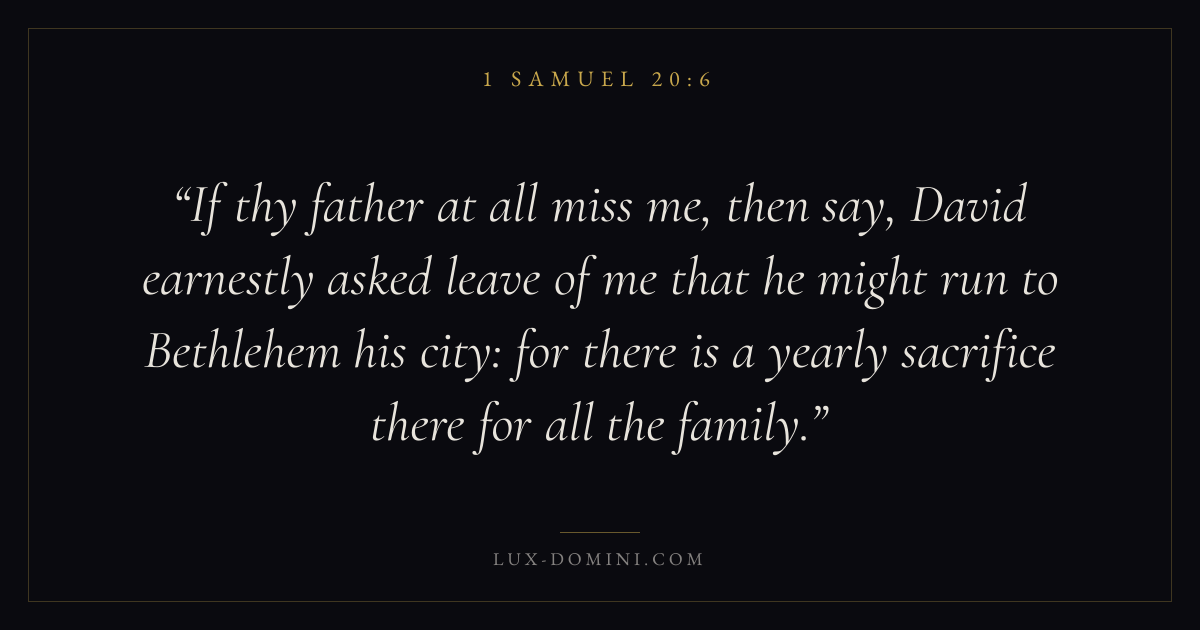 If thy father at all miss me, then say, David earnestly asked leave of me that he might run to Bethlehem his city: for there is a yearly sacrifice there for all the family.