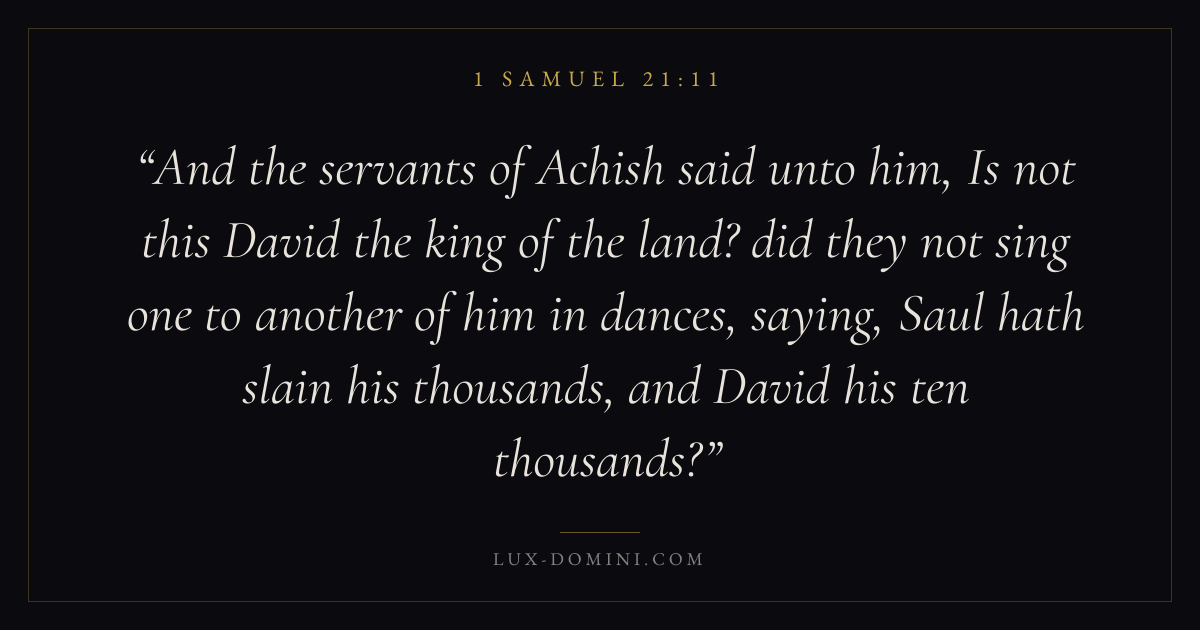 And the servants of Achish said unto him, Is not this David the king of the land? did they not sing one to another of him in dances, saying, Saul hath slain his thousands, and David his ten thousands?