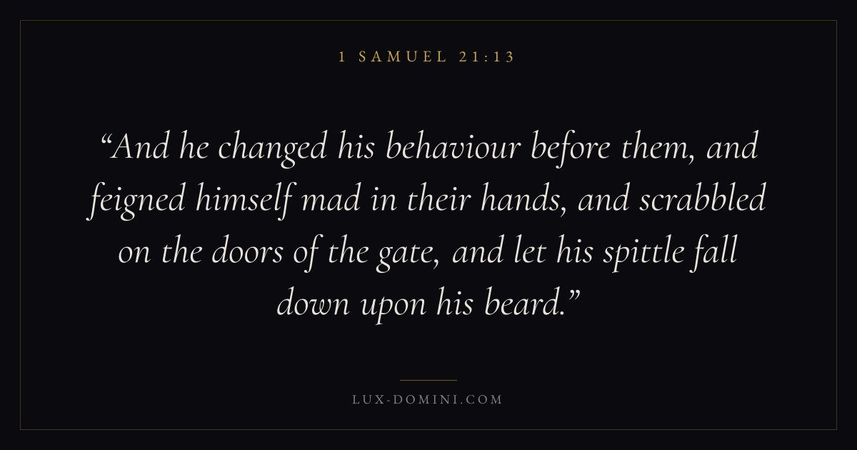 And he changed his behaviour before them, and feigned himself mad in their hands, and scrabbled on the doors of the gate, and let his spittle fall down upon his beard.