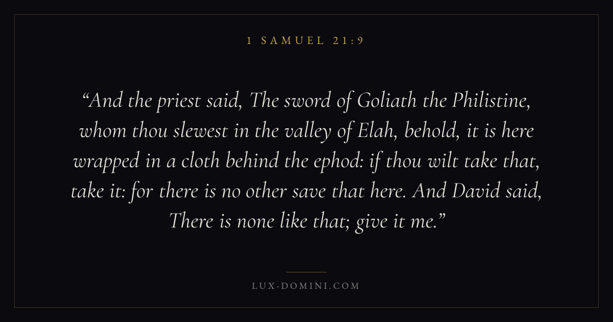 And the priest said, The sword of Goliath the Philistine, whom thou slewest in the valley of Elah, behold, it is here wrapped in a cloth behind the ephod: if thou wilt take that, take it: for there is no other save that here. And David said, There is none like that; give it me.