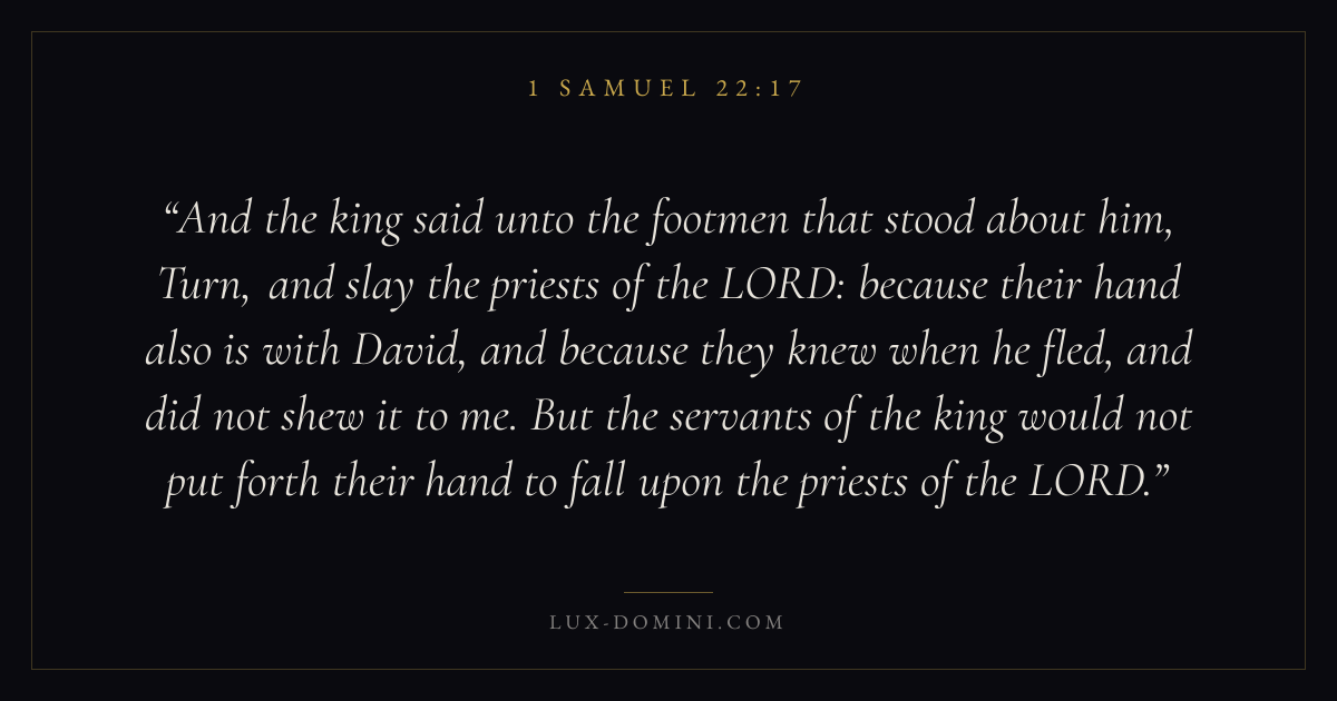 And the king said unto the footmen that stood about him, Turn, and slay the priests of the LORD: because their hand also is with David, and because they knew when he fled, and did not shew it to me. But the servants of the king would not put forth their hand to fall upon the priests of the LORD.