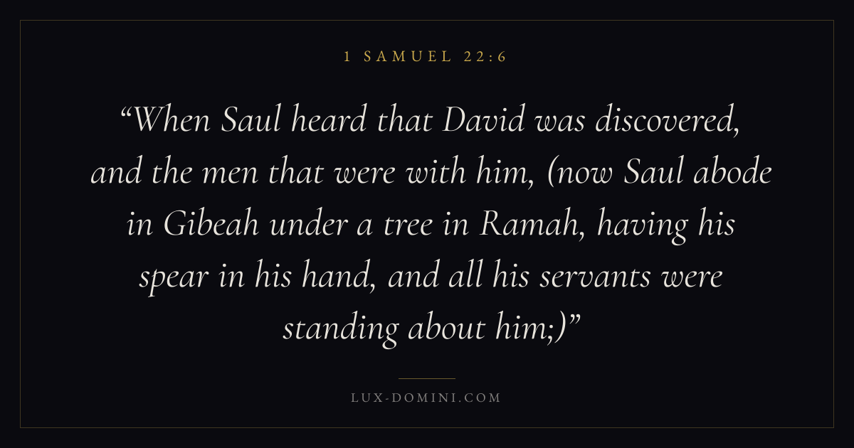When Saul heard that David was discovered, and the men that were with him, (now Saul abode in Gibeah under a tree in Ramah, having his spear in his hand, and all his servants were standing about him;)