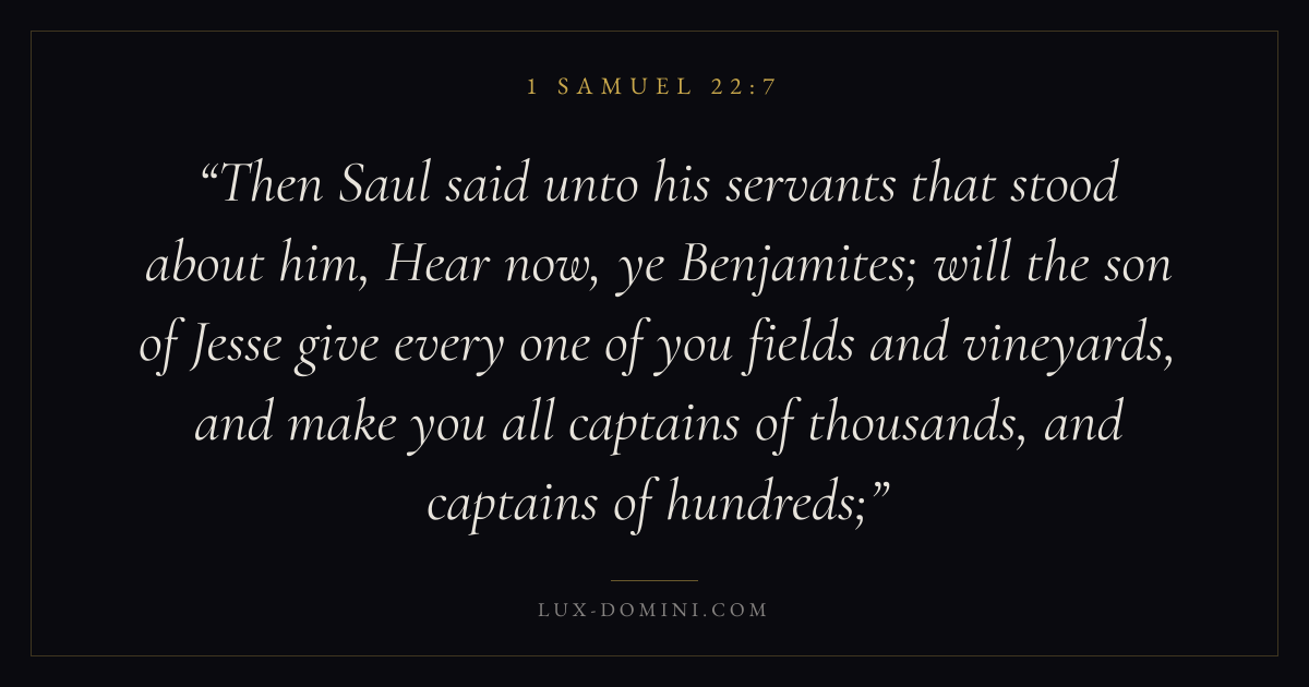 Then Saul said unto his servants that stood about him, Hear now, ye Benjamites; will the son of Jesse give every one of you fields and vineyards, and make you all captains of thousands, and captains of hundreds;