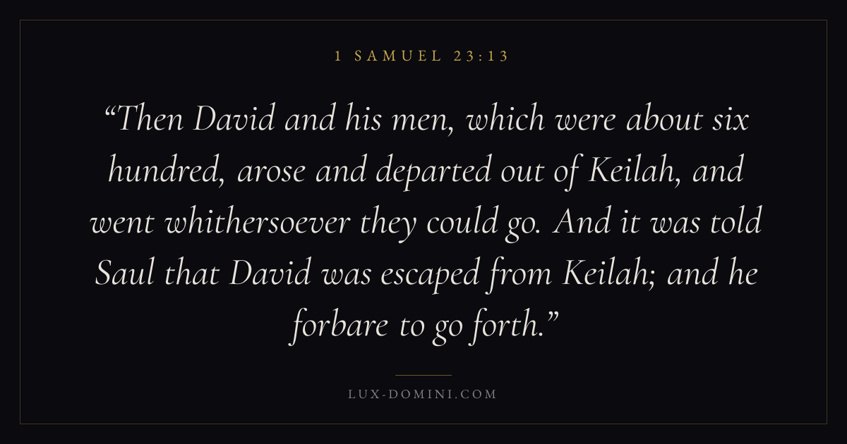 Then David and his men, which were about six hundred, arose and departed out of Keilah, and went whithersoever they could go. And it was told Saul that David was escaped from Keilah; and he forbare to go forth.