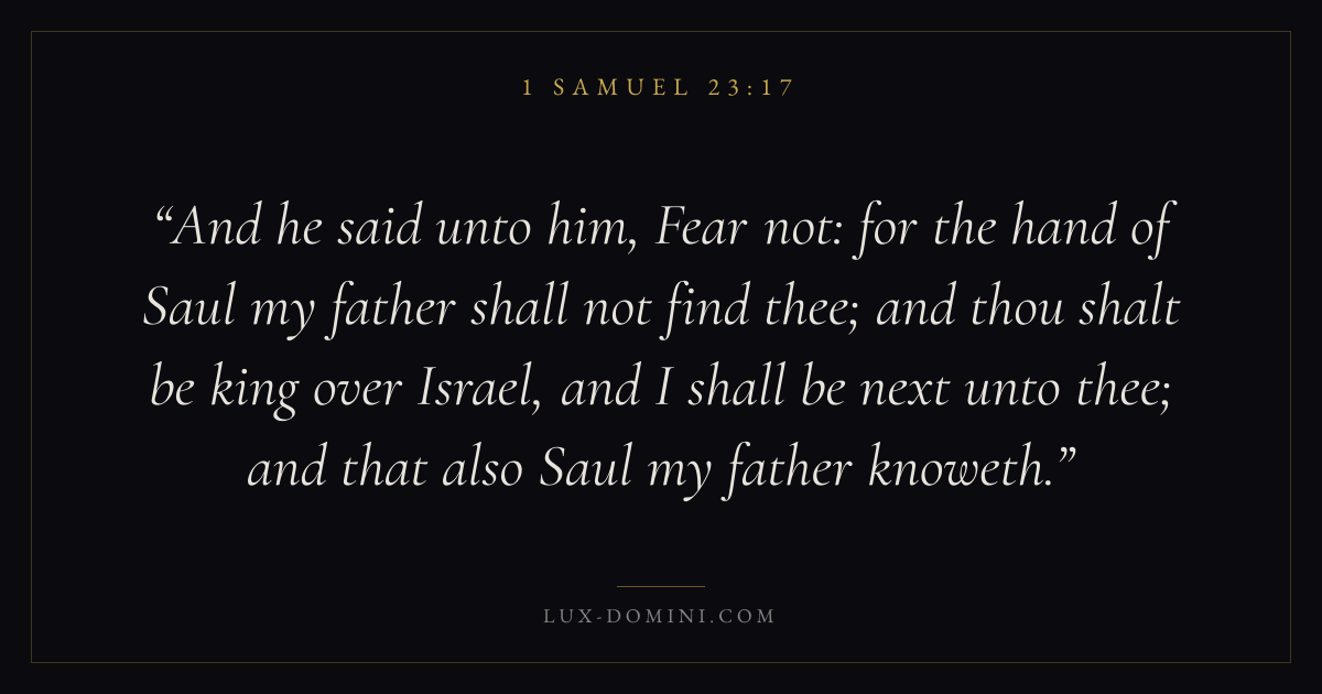 And he said unto him, Fear not: for the hand of Saul my father shall not find thee; and thou shalt be king over Israel, and I shall be next unto thee; and that also Saul my father knoweth.
