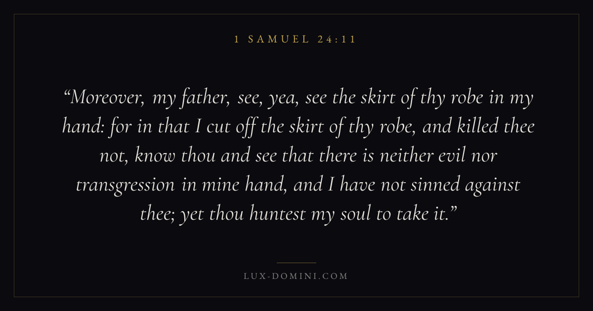 Moreover, my father, see, yea, see the skirt of thy robe in my hand: for in that I cut off the skirt of thy robe, and killed thee not, know thou and see that there is neither evil nor transgression in mine hand, and I have not sinned against thee; yet thou huntest my soul to take it.