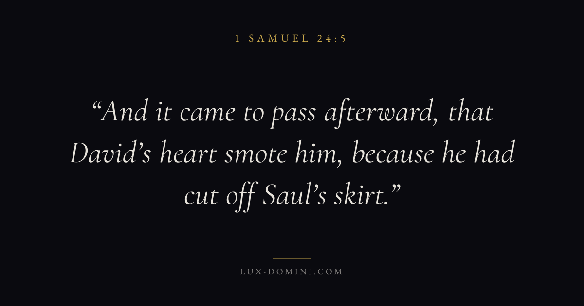 Books / 1 Samuel / Chapter 24 / Verse 5 ← 1 Samuel 24:4 1 Samuel 24:5 1 Samuel 24:6 → And it came to pass afterward, that David’s heart smote him, because he had cut off Saul’s skirt. Download verse card Share on Twitter Share on Facebook Pin it ✦ Key themes FaithHopeLeadershipAnointing Read with 1 Samuel 24:11 Samuel 24:2Hebrews 11:1Romans 10:17 Related topics Bible verses about faithBible verses about hopeBible verses about leadership ✦ 1 Samuel Chapter 24 verses V. 1 V. 2 V. 3 V. 4 V. 5 V. 6 V. 7 V. 8 V. 9 V. 10 V. 11 V. 12 V. 13 V. 14 V. 15 V. 16 V. 17 V. 18 V. 19 V. 20 V. 21 V. 22