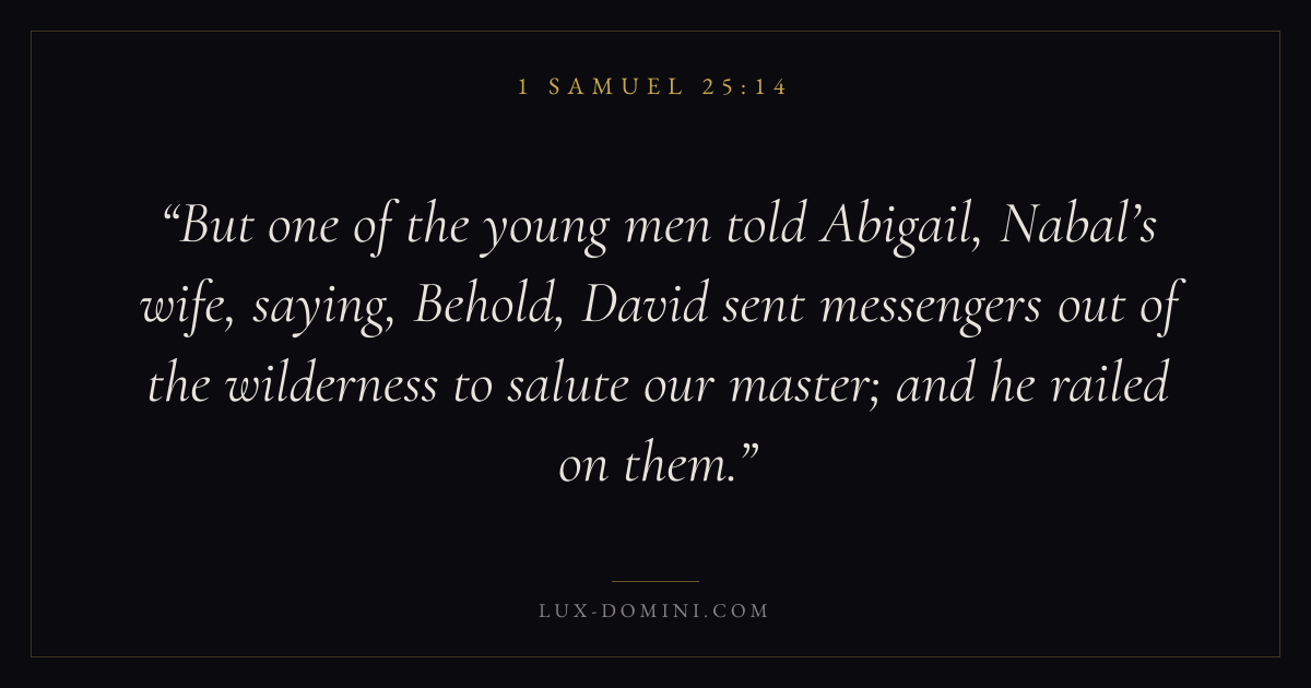 But one of the young men told Abigail, Nabal’s wife, saying, Behold, David sent messengers out of the wilderness to salute our master; and he railed on them.