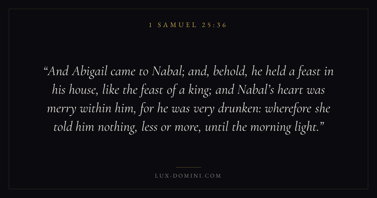 And Abigail came to Nabal; and, behold, he held a feast in his house, like the feast of a king; and Nabal’s heart was merry within him, for he was very drunken: wherefore she told him nothing, less or more, until the morning light.