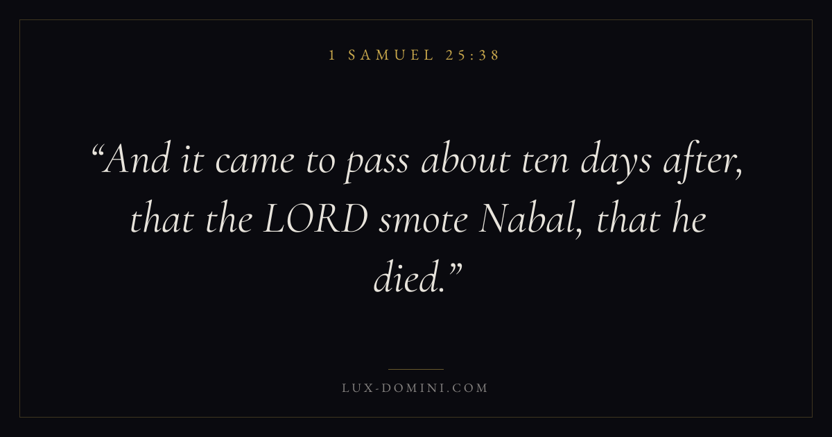 Books / 1 Samuel / Chapter 25 / Verse 38 ← 1 Samuel 25:37 1 Samuel 25:38 1 Samuel 25:39 → And it came to pass about ten days after, that the LORD smote Nabal, that he died. Download verse card Share on Twitter Share on Facebook Pin it ✦ Key themes HopeLeadershipAnointingObedience Read with 1 Samuel 25:361 Samuel 25:37Romans 8:24Revelation 21:4 Related topics Bible verses about hopeBible verses about leadershipBible verses about obedience ✦ 1 Samuel Chapter 25 verses V. 1 V. 2 V. 3 V. 4 V. 5 V. 6 V. 7 V. 8 V. 9 V. 10 V. 11 V. 12 V. 13 V. 14 V. 15 V. 16 V. 17 V. 18 V. 19 V. 20 V. 21 V. 22 V. 23 V. 24 V. 25 V. 26 V. 27 V. 28 V. 29 V. 30 V. 31 V. 32 V. 33 V. 34 V. 35 V. 36 V. 37 V. 38 V. 39 V. 40 V. 41 V. 42 V. 43 V. 44