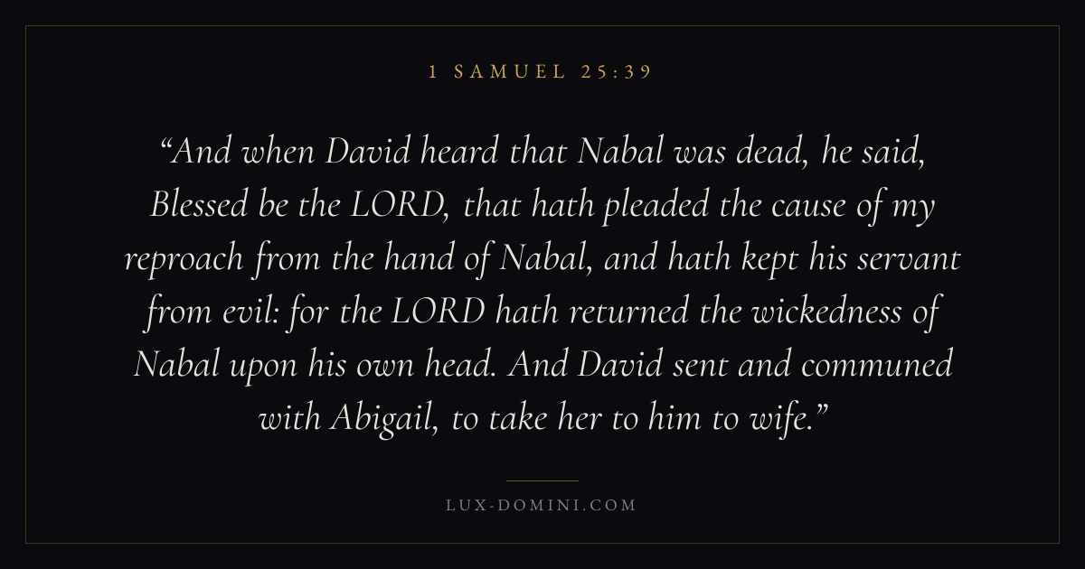 And when David heard that Nabal was dead, he said, Blessed be the LORD, that hath pleaded the cause of my reproach from the hand of Nabal, and hath kept his servant from evil: for the LORD hath returned the wickedness of Nabal upon his own head. And David sent and communed with Abigail, to take her to him to wife.