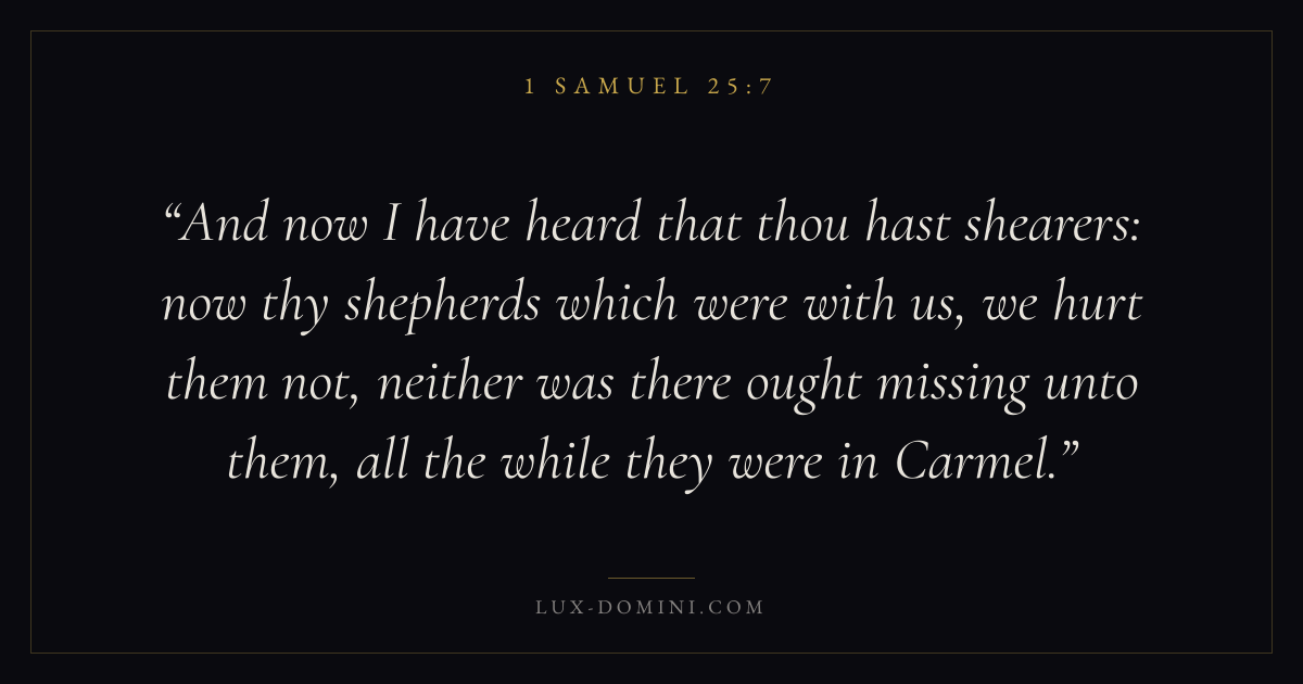 And now I have heard that thou hast shearers: now thy shepherds which were with us, we hurt them not, neither was there ought missing unto them, all the while they were in Carmel.