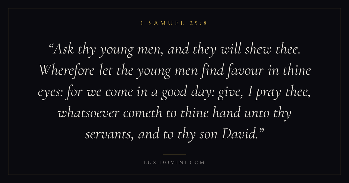 Ask thy young men, and they will shew thee. Wherefore let the young men find favour in thine eyes: for we come in a good day: give, I pray thee, whatsoever cometh to thine hand unto thy servants, and to thy son David.