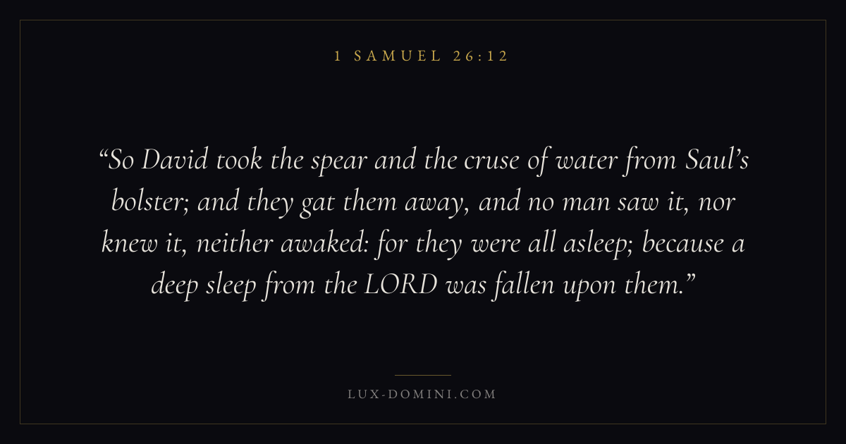 So David took the spear and the cruse of water from Saul’s bolster; and they gat them away, and no man saw it, nor knew it, neither awaked: for they were all asleep; because a deep sleep from the LORD was fallen upon them.