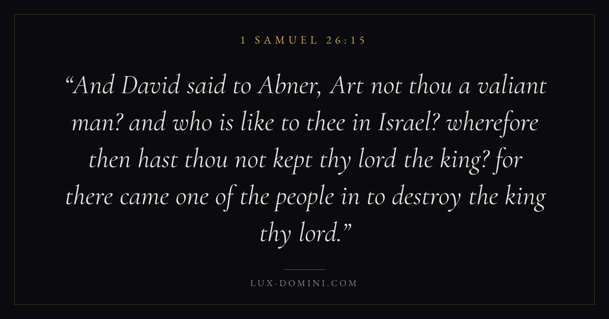 And David said to Abner, Art not thou a valiant man? and who is like to thee in Israel? wherefore then hast thou not kept thy lord the king? for there came one of the people in to destroy the king thy lord.