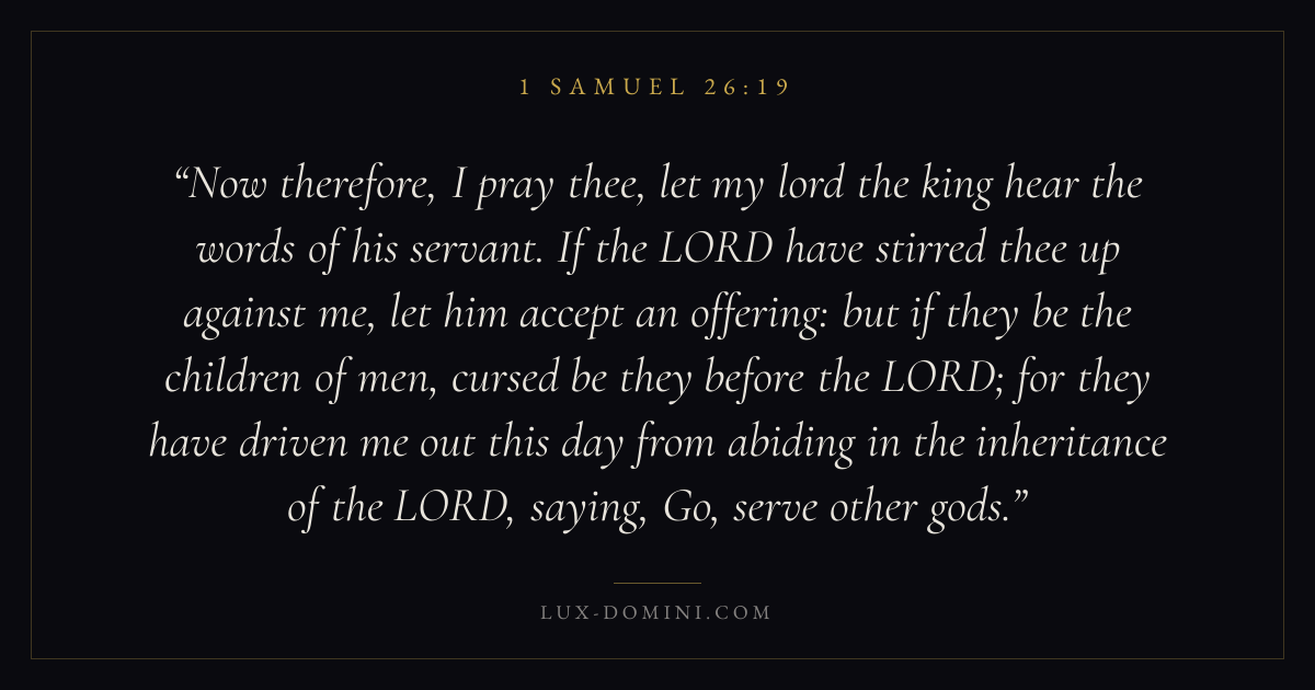 Now therefore, I pray thee, let my lord the king hear the words of his servant. If the LORD have stirred thee up against me, let him accept an offering: but if they be the children of men, cursed be they before the LORD; for they have driven me out this day from abiding in the inheritance of the LORD, saying, Go, serve other gods.