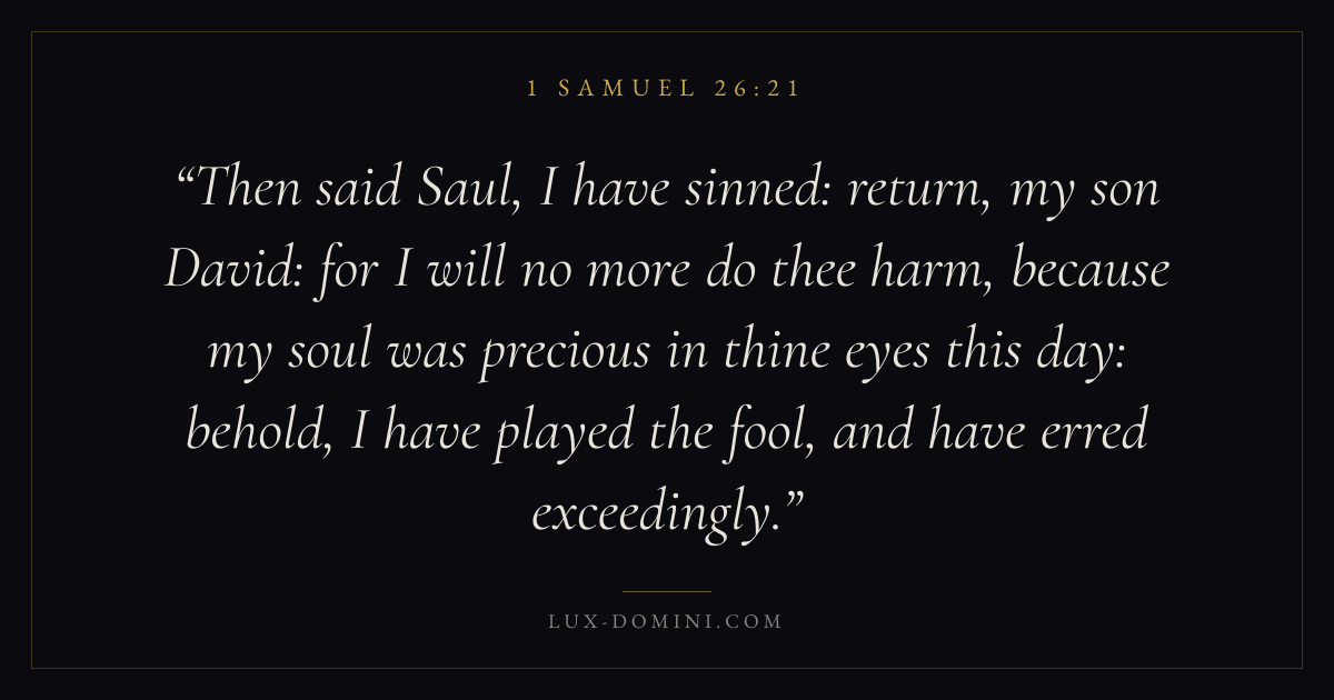 Then said Saul, I have sinned: return, my son David: for I will no more do thee harm, because my soul was precious in thine eyes this day: behold, I have played the fool, and have erred exceedingly.
