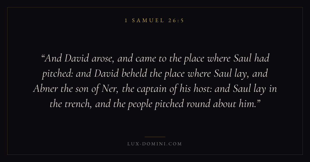 And David arose, and came to the place where Saul had pitched: and David beheld the place where Saul lay, and Abner the son of Ner, the captain of his host: and Saul lay in the trench, and the people pitched round about him.
