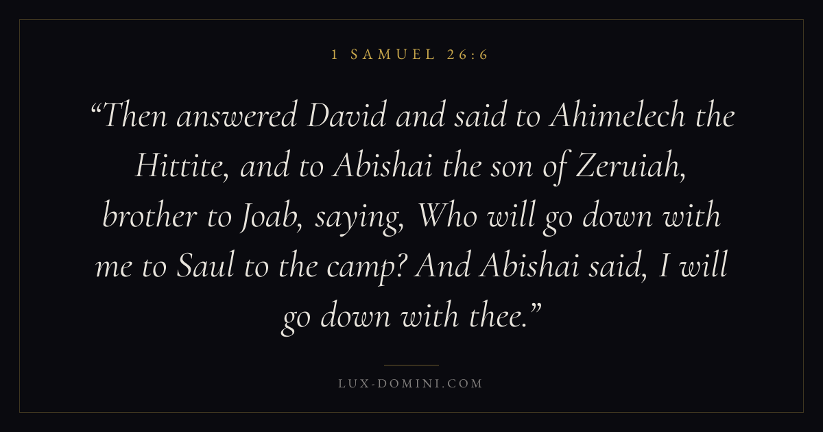 Then answered David and said to Ahimelech the Hittite, and to Abishai the son of Zeruiah, brother to Joab, saying, Who will go down with me to Saul to the camp? And Abishai said, I will go down with thee.