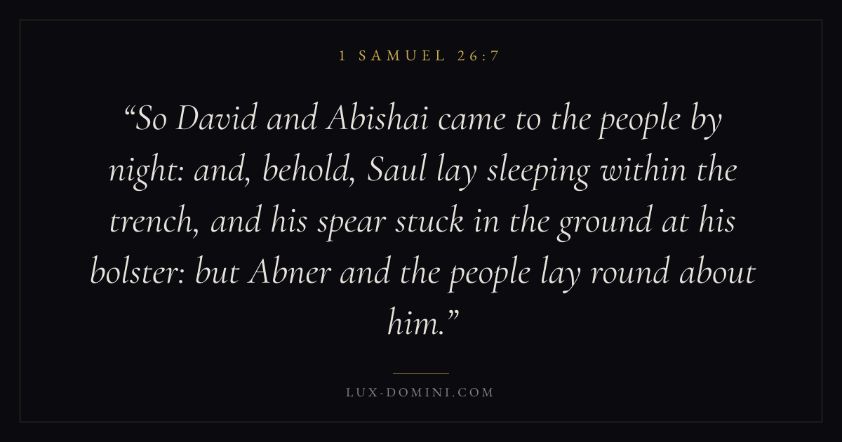 So David and Abishai came to the people by night: and, behold, Saul lay sleeping within the trench, and his spear stuck in the ground at his bolster: but Abner and the people lay round about him.