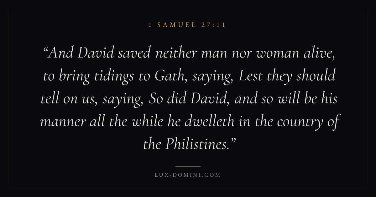 And David saved neither man nor woman alive, to bring tidings to Gath, saying, Lest they should tell on us, saying, So did David, and so will be his manner all the while he dwelleth in the country of the Philistines.