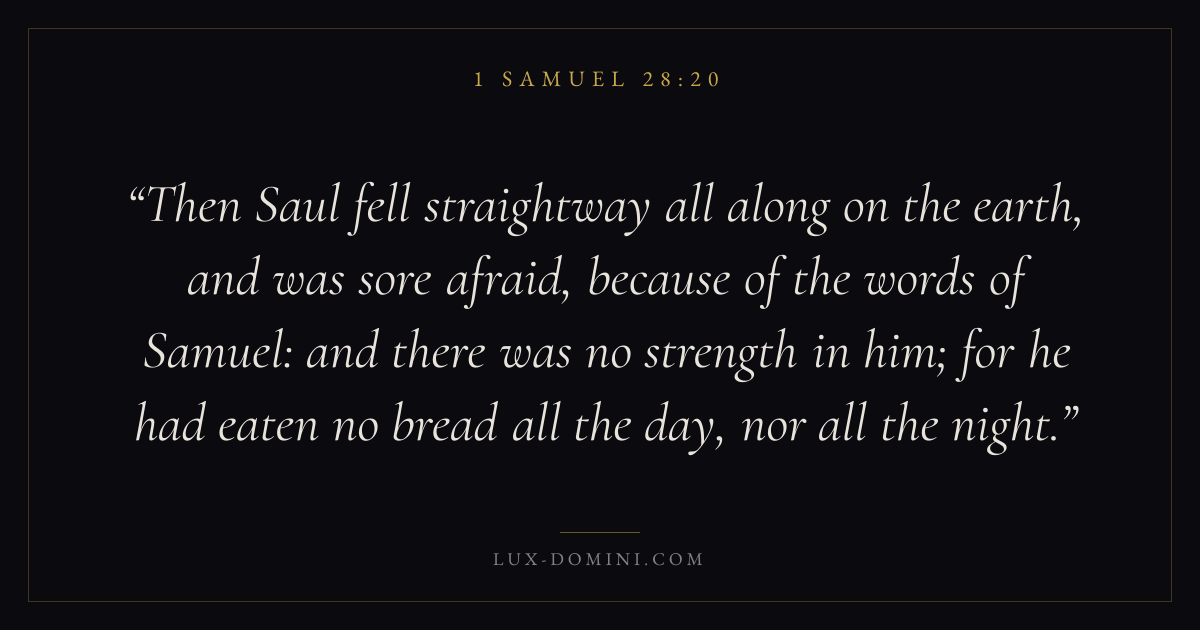 Then Saul fell straightway all along on the earth, and was sore afraid, because of the words of Samuel: and there was no strength in him; for he had eaten no bread all the day, nor all the night.