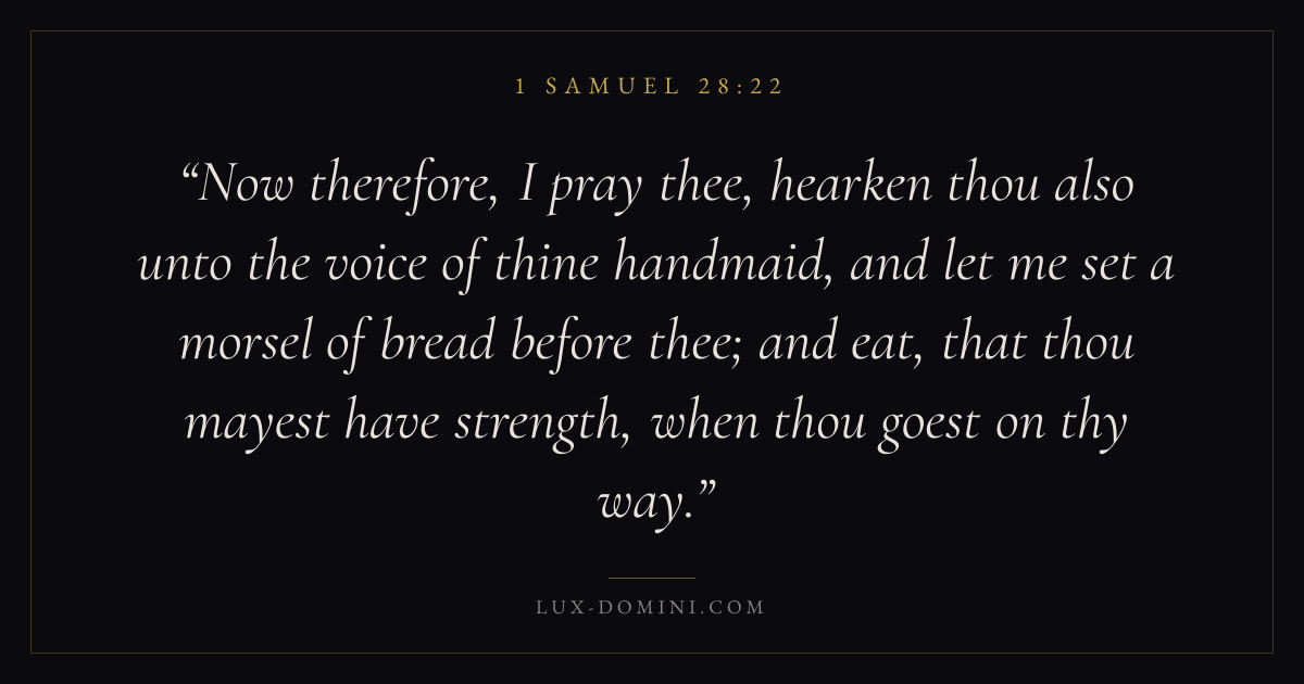 Now therefore, I pray thee, hearken thou also unto the voice of thine handmaid, and let me set a morsel of bread before thee; and eat, that thou mayest have strength, when thou goest on thy way.