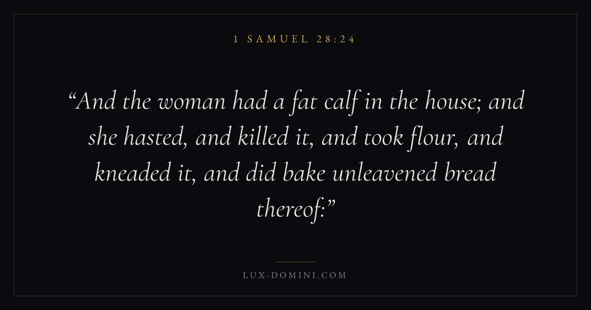 And the woman had a fat calf in the house; and she hasted, and killed it, and took flour, and kneaded it, and did bake unleavened bread thereof: