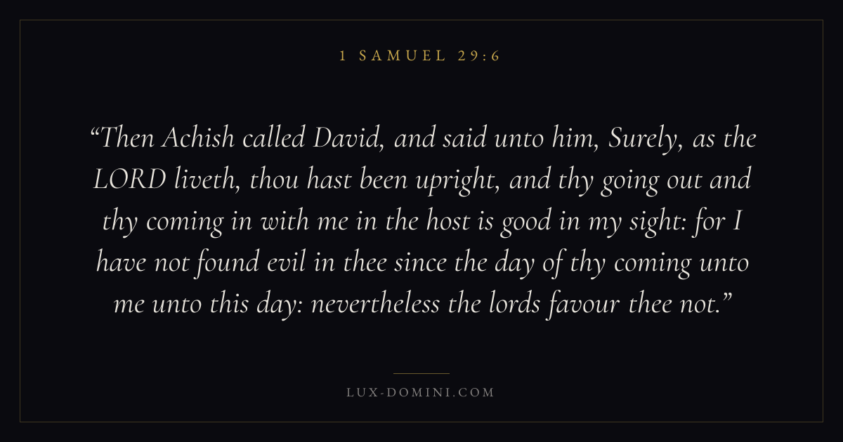 Then Achish called David, and said unto him, Surely, as the LORD liveth, thou hast been upright, and thy going out and thy coming in with me in the host is good in my sight: for I have not found evil in thee since the day of thy coming unto me unto this day: nevertheless the lords favour thee not.