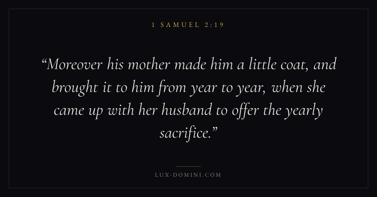 Moreover his mother made him a little coat, and brought it to him from year to year, when she came up with her husband to offer the yearly sacrifice.