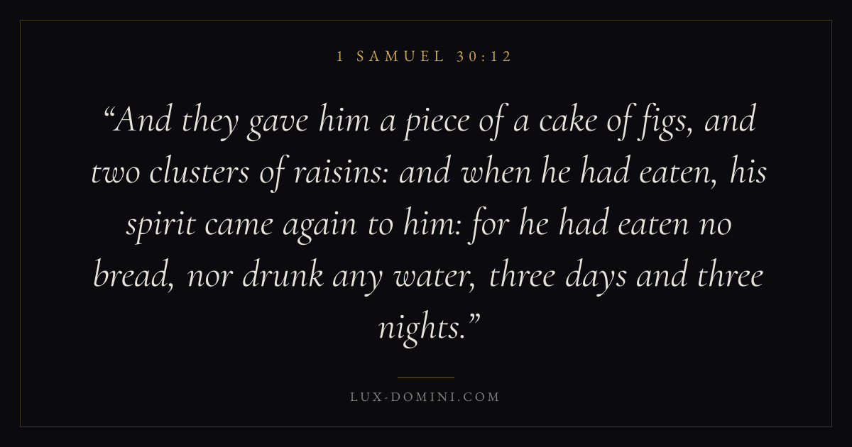 And they gave him a piece of a cake of figs, and two clusters of raisins: and when he had eaten, his spirit came again to him: for he had eaten no bread, nor drunk any water, three days and three nights.