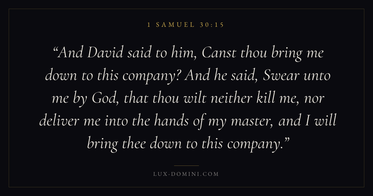 And David said to him, Canst thou bring me down to this company? And he said, Swear unto me by God, that thou wilt neither kill me, nor deliver me into the hands of my master, and I will bring thee down to this company.