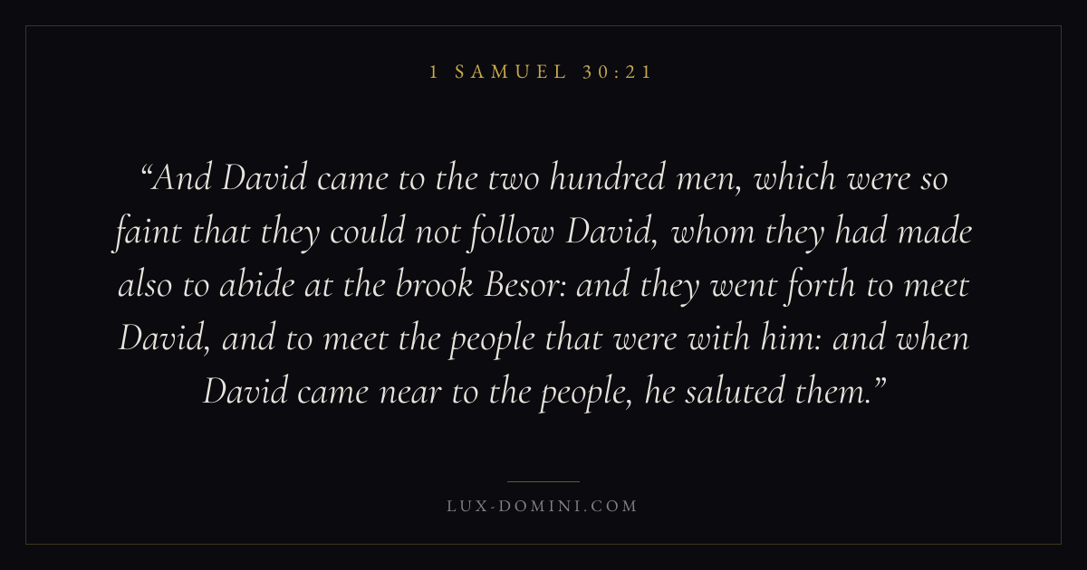 And David came to the two hundred men, which were so faint that they could not follow David, whom they had made also to abide at the brook Besor: and they went forth to meet David, and to meet the people that were with him: and when David came near to the people, he saluted them.